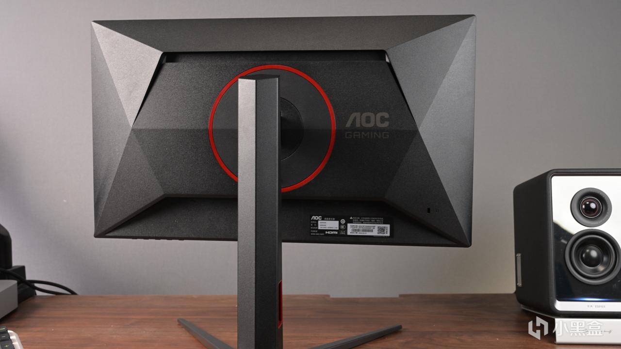 這一套模具AOC用了蠻久,這個底座一直沒有改。相對比螞蟻電競和飛利浦,Q25G4S的底座角度更小,底座伸出屏幕更多,對較少部分的FPS用戶的拉槍操作顯然會造成影響。