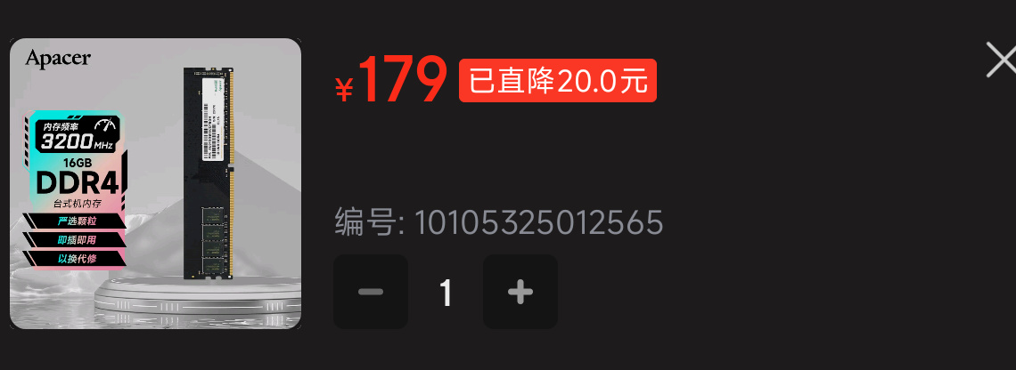 然後看內存,宇瞻3200MHz。我問了客服,是給單條16G。價格在💰179~💰185區間。咱算他💰179。