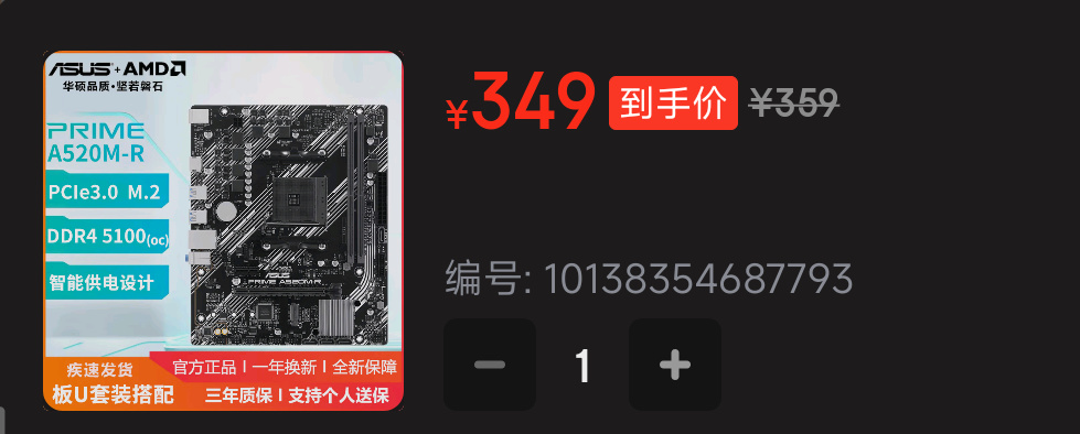 然後就是主板,攀升 A520M-B?這是個啥,搜也沒搜到具體售價,只能以隔壁相同型號的板子來算算了。姑且算他💰349。