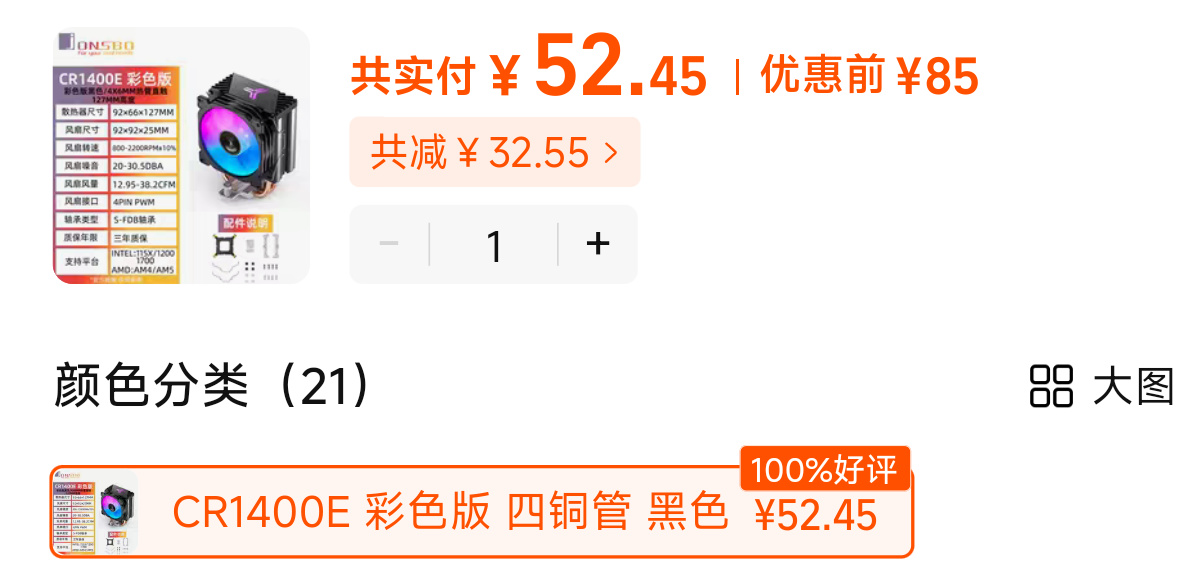 再來看散熱,他沒敢寫品牌和型號,姑且算他💰52塊錢。