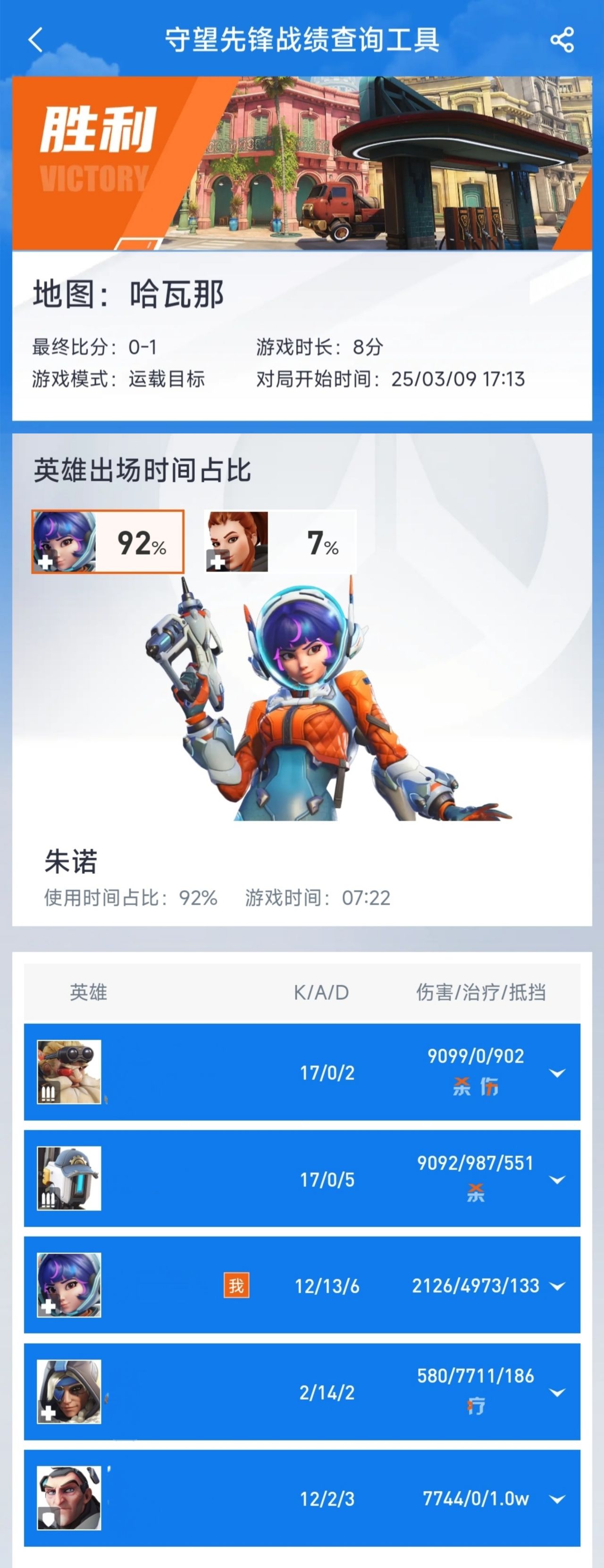 可查看比賽模式,地圖,比分,英雄使用佔比時長,隊友kda,傷害量,治療量等數據