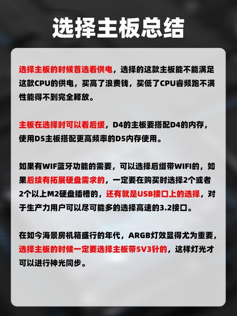 选择主板的时候首选看供电,选择的这款主板能不能满足这款CPU的供电,买高了浪费钱,买低了CPU睿频跑不满性能得不到完全释放。