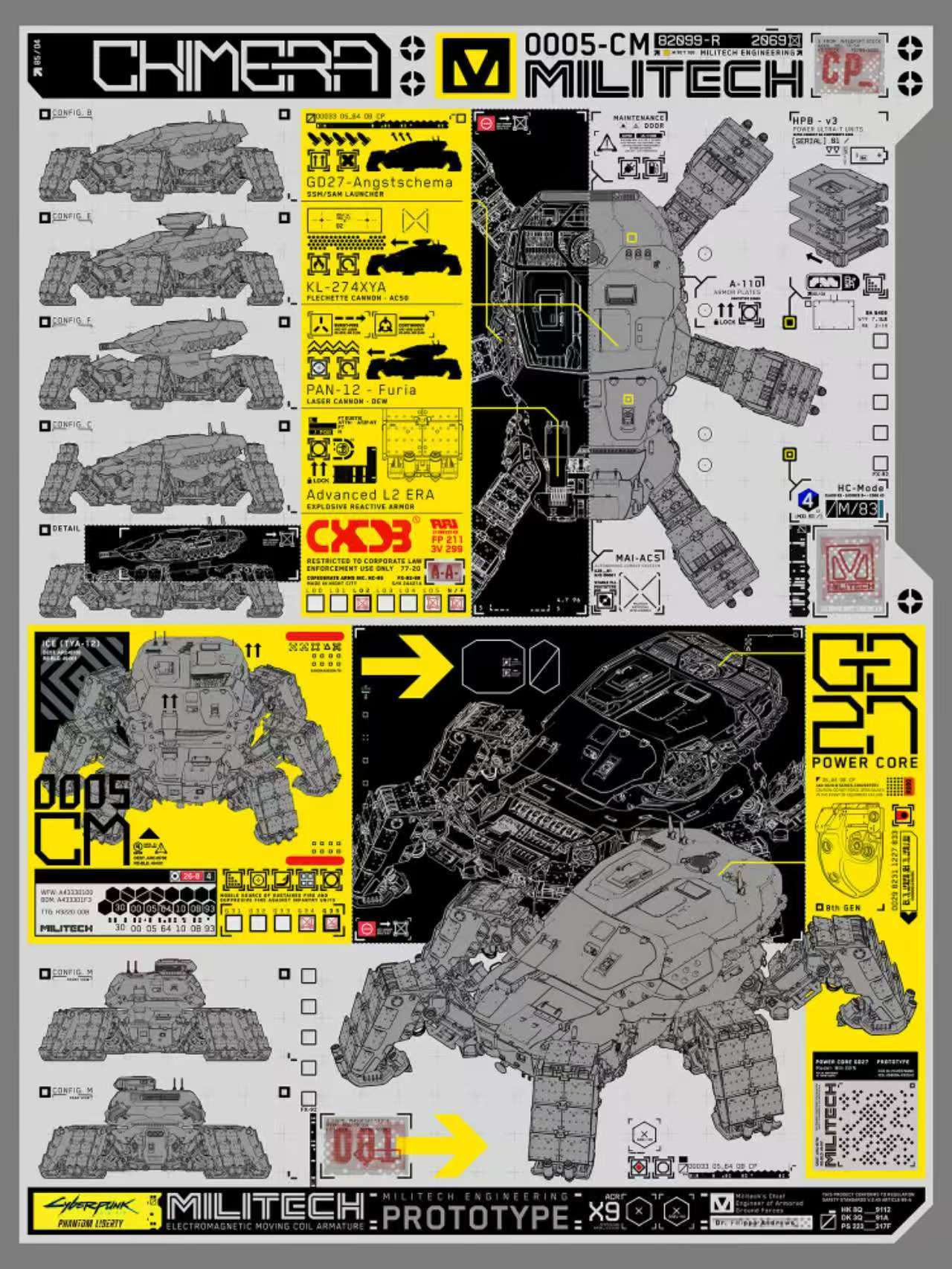 奇美拉坦克在2065年到2069年期間研製。標準武器配備包括KL-274XYA箭形彈火炮、PAN-12暴起激光炮、具備地對地和地對空能力(SSM/SAM)的GD27-恐懼圖式發射器、戰鬥瓦斯噴霧器、煙幕發生裝置以及抵禦敵方黑客入侵的精密ICE賽博防禦系統(TYA-12)。