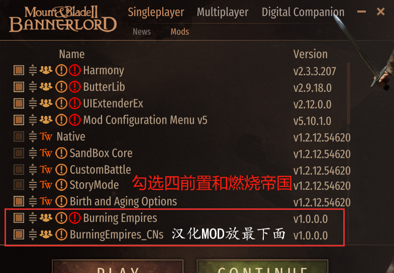 3、安裝好“燃燒帝國”MOD後,打開啓動器,按照下方圖片進行排序即可進入遊戲