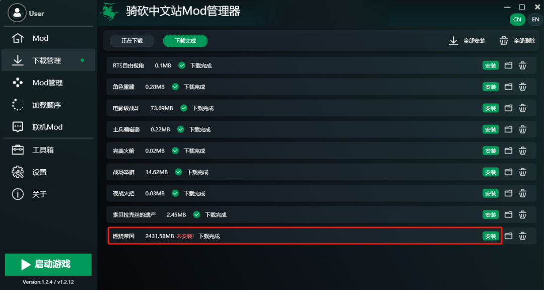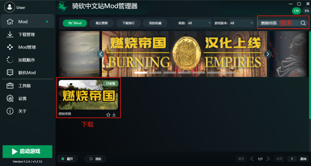 也可以直接百度搜索“騎砍中文站 下載中心”,進入下載站後搜索“燃燒帝國”進行下載。