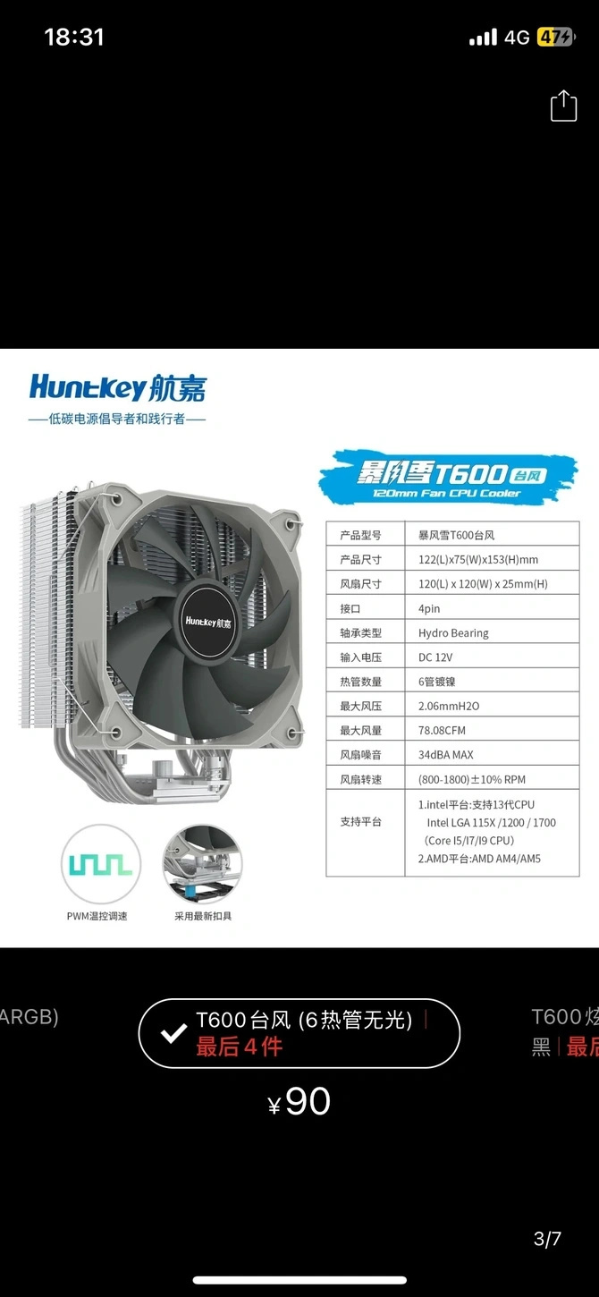 航嘉t600 90元 單塔單12cm風扇六銅管