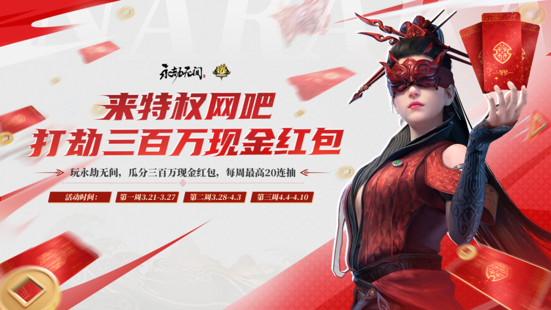 下週五(3月21日)起,來特權網吧打永劫,瓜分三百萬現金紅包!我們的目標只有一個,那就是希望大家拿得多,玩得開心!