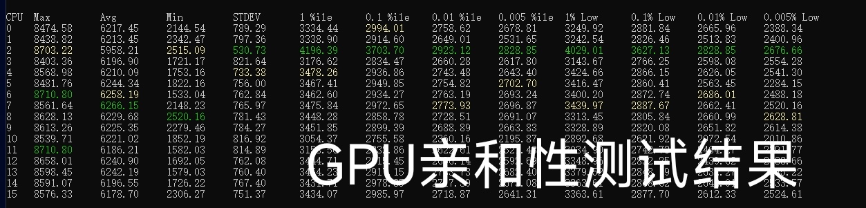 AutoGpuAffinity需搭配GointerruptPolicy使用。大致原理是分別測試GPU和單獨核心線程的親和性,親和性越高,GPU在渲染測試裏面跑出的平均幀越高,low幀越穩。這個步驟可能會花20分鐘左右,但是相信我,絕對對得起花的這個時間