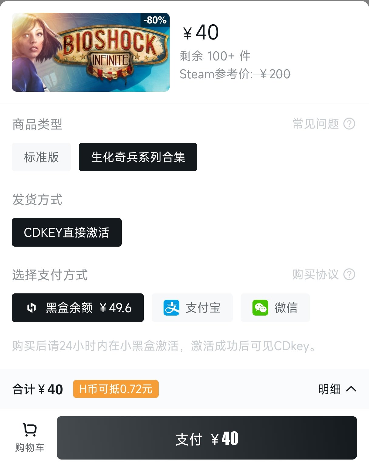 幸运的是,在今年春促中,《生化奇兵合集》的价格竟然只需要40RMB,远低于我的预期!于是我毫不犹豫地入手了。