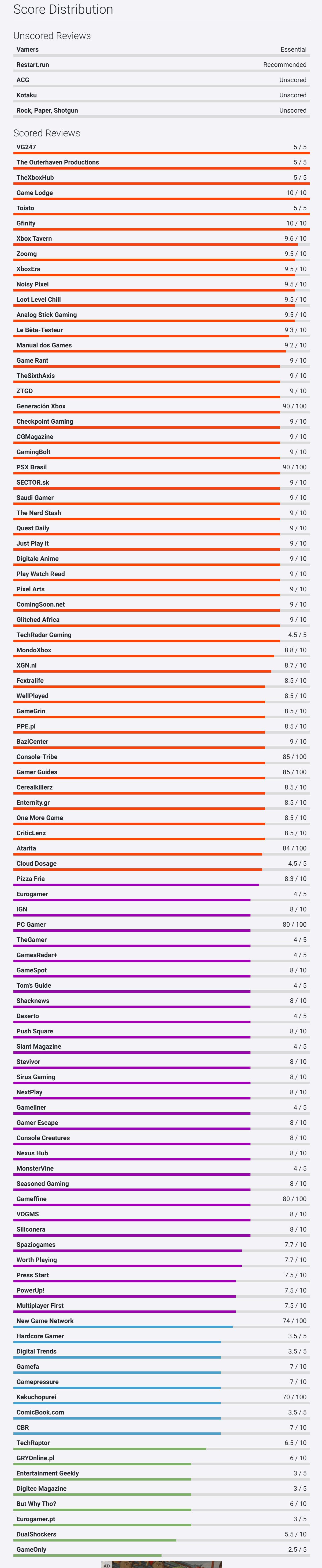 OpenCritic 收录 98 家媒体,均分为 81 分,推荐率 85 %。