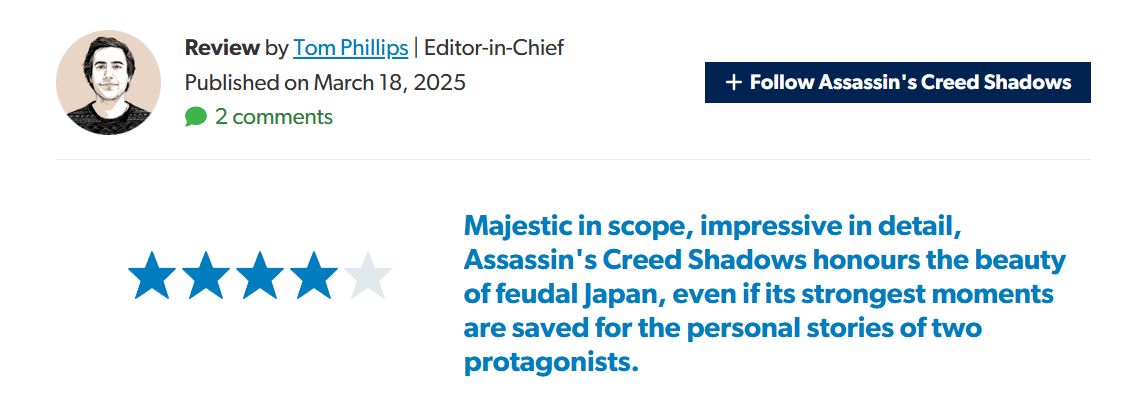 《刺客信条:影》媒体评分现已正式解禁,本作将于 2025 年 3 月 20 日发售(现已开启预载),登陆 PC、Xbox Series X/S、PS5 平台。