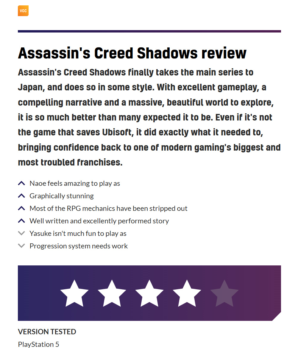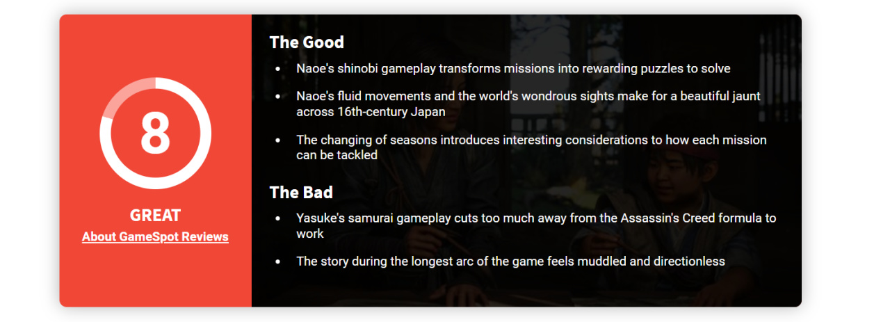 通过进一步优化和改进其现有系统,《刺客信条:影》成功打造出了该系列过去十年中不断打磨的开放世界风格的最佳版本之一。