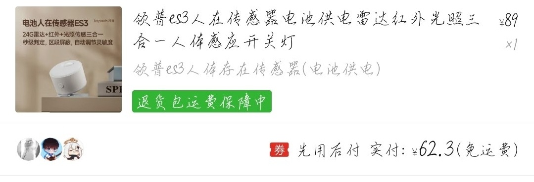 这玩意就是我上面说的东西啦,配合这个就能做到人在开灯,人走关灯啦。我看又说活动 50 左右买到的,可以等等看哦。