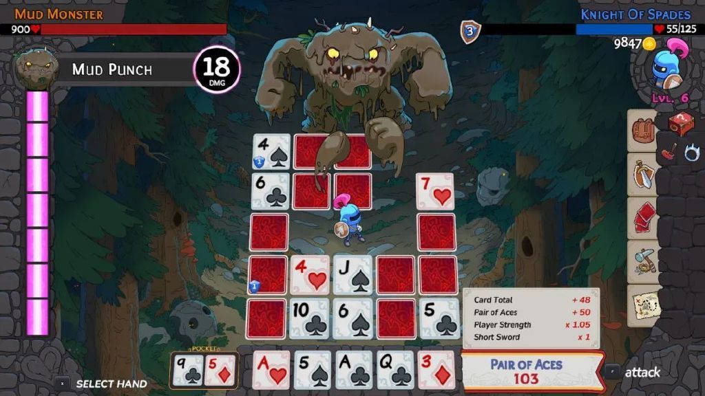 在棋盤上移動撿起牌,組合牌型與怪物對決。