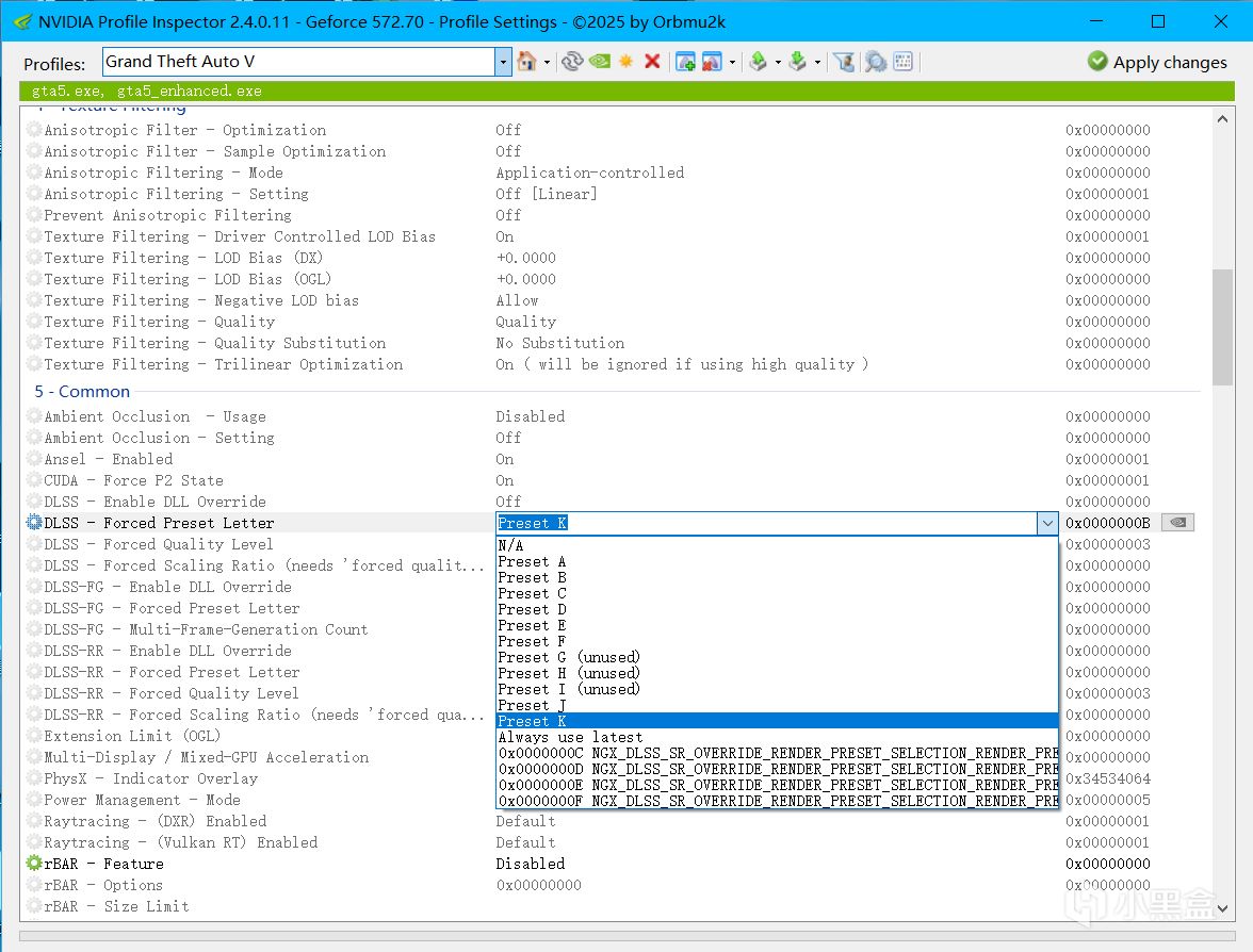 这里点击顶部选择你要修改的程序,默认的_GLOBAL_DRIVER_PROFILE (Base Profile)选项是修改全局,找到第五项的DLSS-Forced Prest Letter,将其修改成最新的预设K,你也可以在这里修改帧生成和光线重建的DLSS版本,然后点击右上角的Apply changes保存