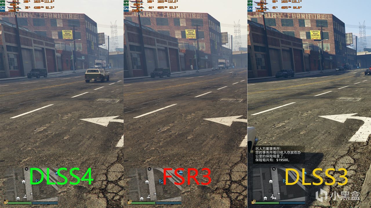 可能由于截图的原因对比不够明显,DLSS4无论是植被清晰度和阴影,灯牌文字清晰度或者移动过程中马路地面划线的清晰度都是最佳的,老模型DLSS3次之,FSR垫底。尤其是地面画质,FSR对于这种细小破碎物体的处理非常的差,可以看到非常明显的闪烁感,在面对随处可见的汽车中网和路边的护栏时更是明显