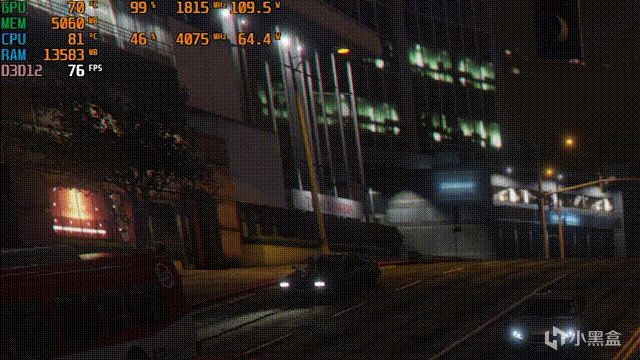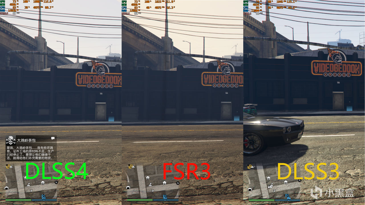 在晚上的日蚀塔楼下面开车绕圈,DLSS4大概80帧上下浮动,FSR3有90帧,DLSS3可以达到95帧浮动