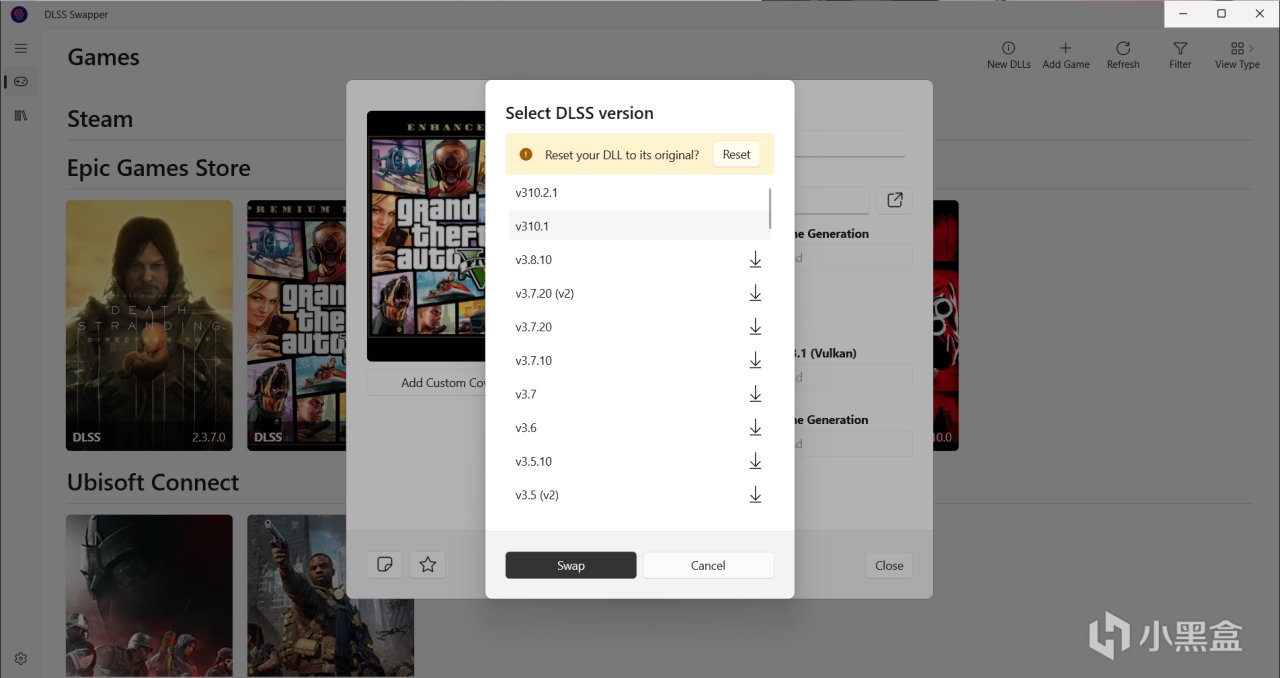 点击游戏图标,再点击DLSS或者其他想更换的版本,点击下载最新的v310.2.1,点左下角Swap更换,如果想还原点击Reset即可