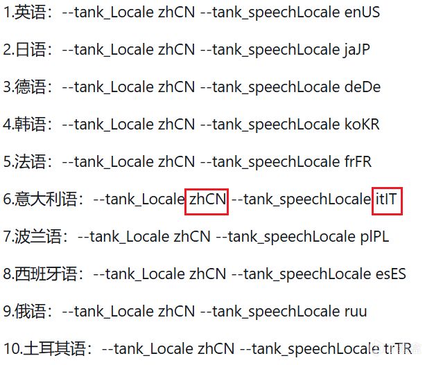如:--tank_Locale enUS --tank_speechLocale enUS