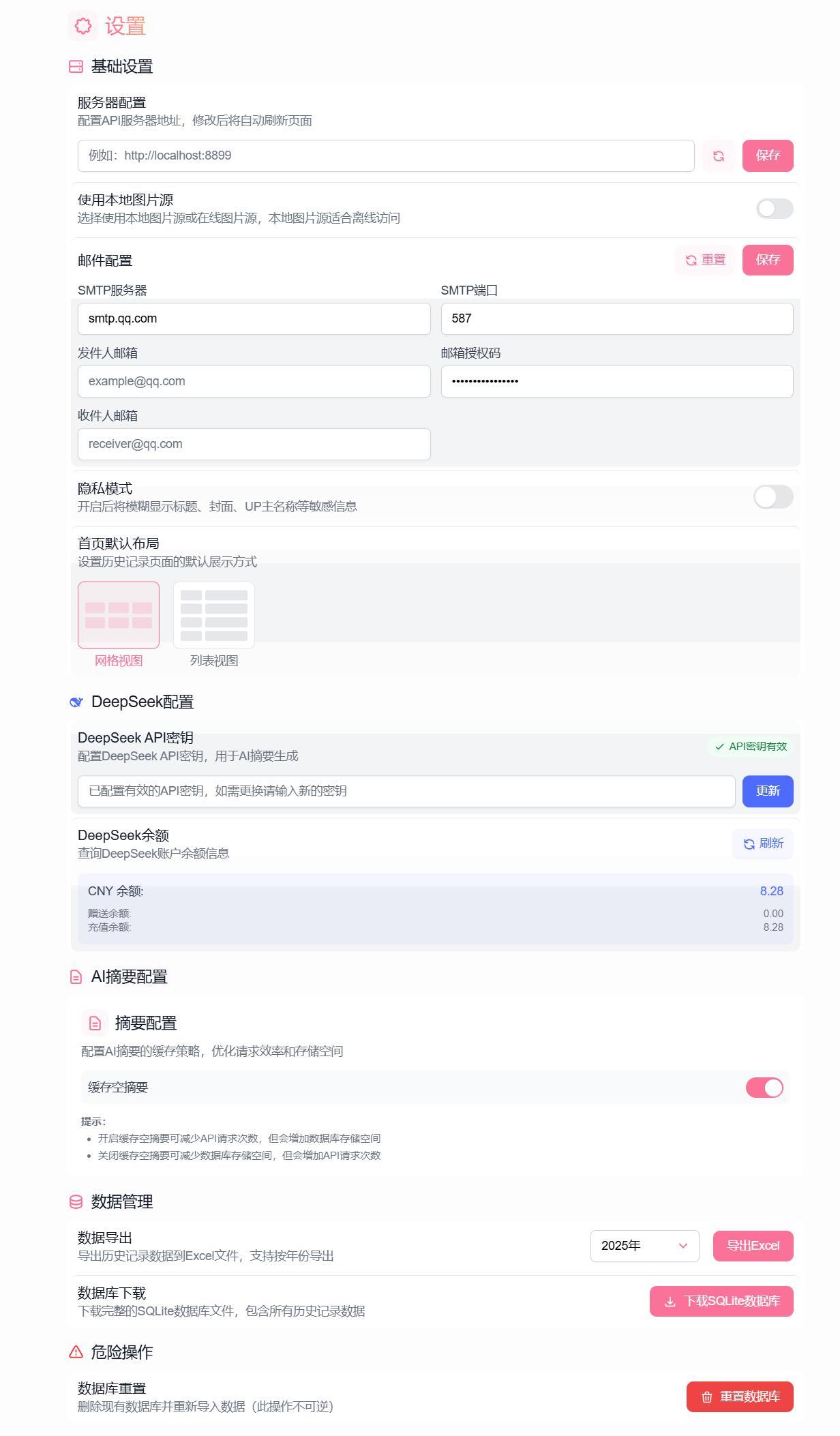 首页功能丰富而直观,灵活的布局切换:列表/卡片视图随心切换,多条件智能筛选:时间范围、UP主、视频分类、标题关键词...个性化备注系统:为重要视频添加备注,隐私保护模式:一键模糊敏感信息,安心在公共场合使用,数据增量更新:自动比对已有数据,只获取新增历史记录