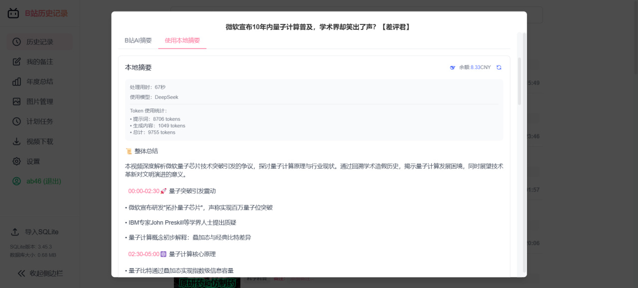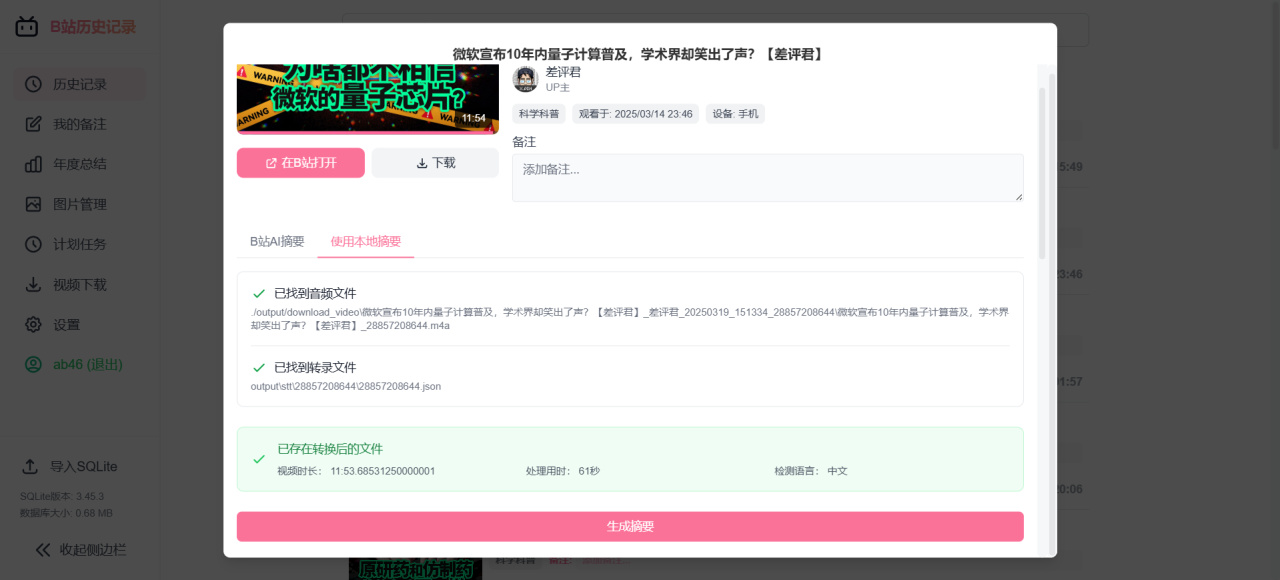 B站AI摘要不够好,想自己DIY?得益于开源项目 Faster whisper (用于音频转文字),和AI大模型(用于摘要生成),本项目里使用的是DeepSeek,首先系统会检测资源,合格后,首先会提示用户下载音频,下载好后,可以滑动到下面选择转换模型,这里推荐tiny模型,速度很快,下载好模型后,就可以开始音频转文字了,转换后,然后点击生成摘要即可