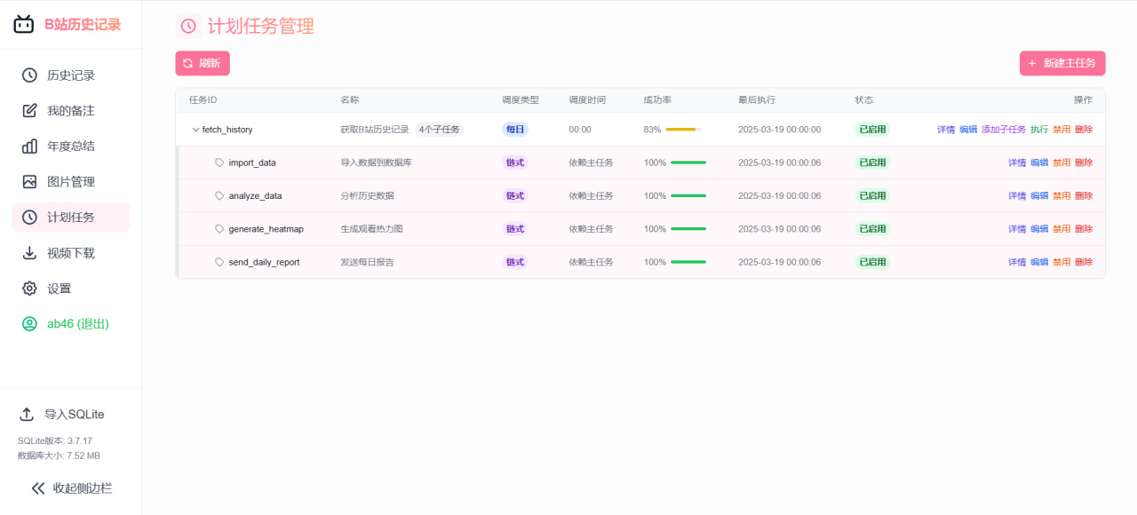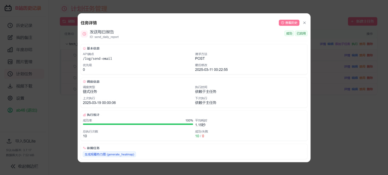 计划任务系统可以设置任务的时间,类型,依赖项等,默认模板是每天凌晨自动获取新增历史记录,并通过邮件通知向你汇报运行日志,以此来实现自动同步历史记录