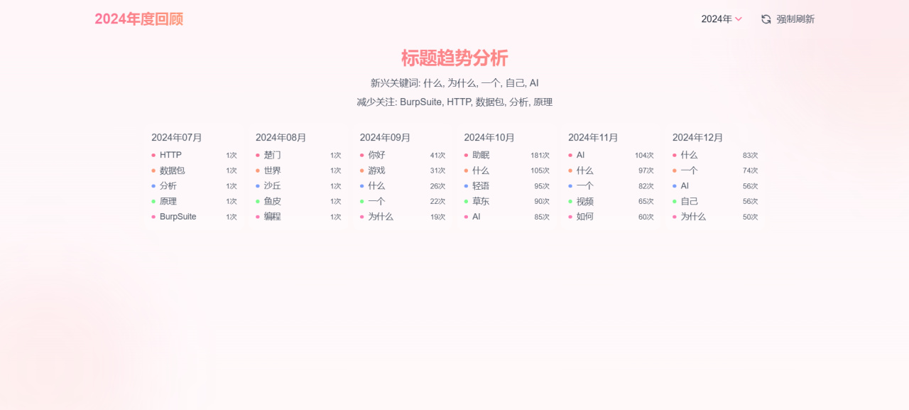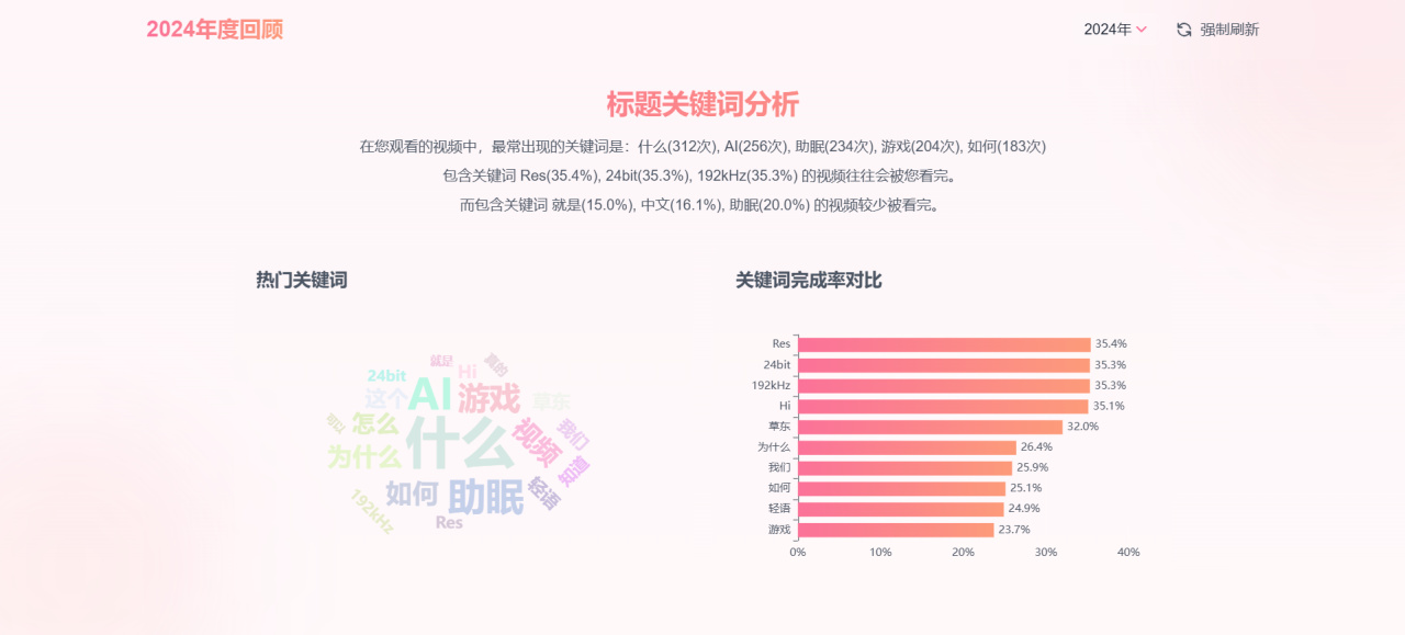 标题关键词分析如同你的兴趣雷达,通过词云图捕捉高频词汇——比如"AI"、"游戏"等关键词的密集出现暗示着你的兴趣焦点。更有趣的是,系统会追踪这些关键词的月度变化,比如从年初的"HTTP"、"分析"到年末的"AI"、"什么"的演变轨迹,甚至能预测你近期可能关注的新兴领域。这些洞察都能帮助你更好地理解自己的观看偏好。