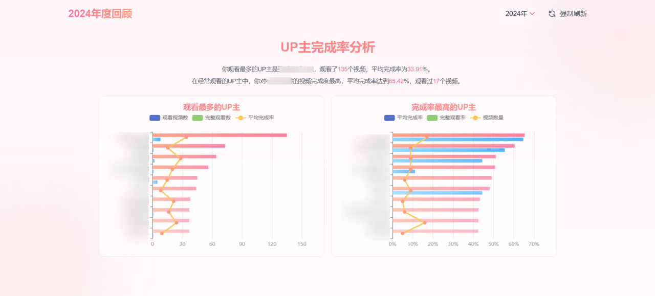在UP主互动分析板块,系统会揭示你与内容创作者的深度联系。例如统计显示你关注的8074个UP主中,平均视频完成率达到61%,双轴对比图表会同时展示观看次数最多的UP主和完成率最高的创作者