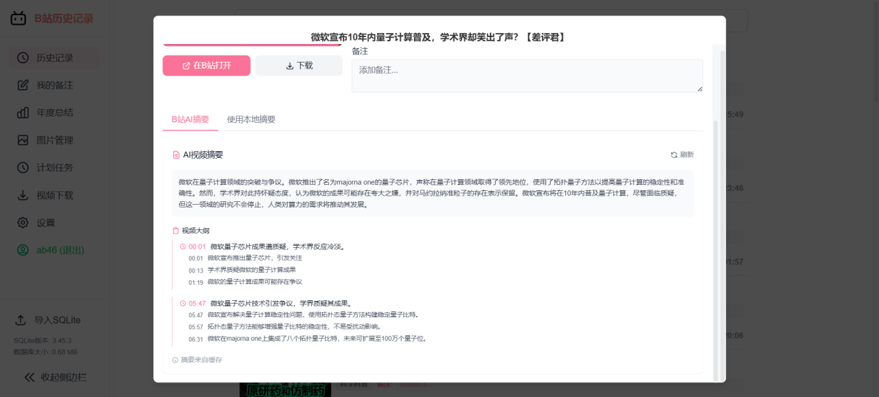 B站AI摘要可以让你更快的回想之前看过的视频内容,总结也很到位