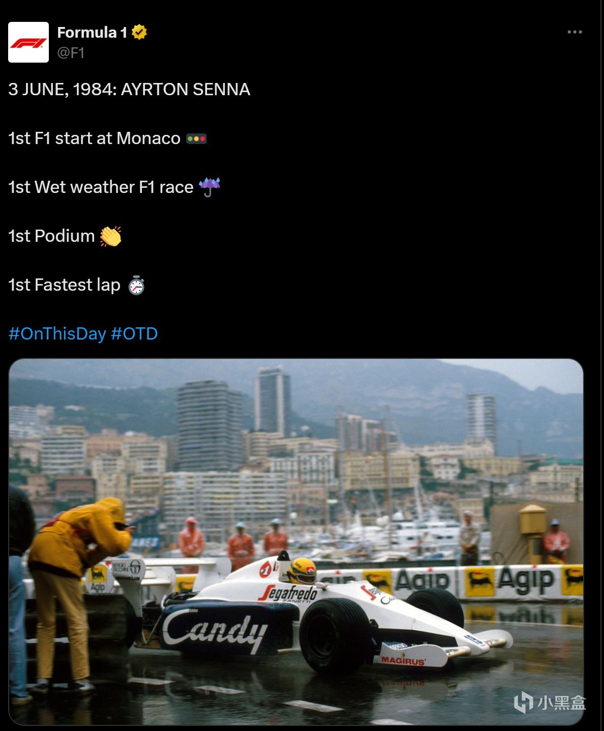 摩纳哥雨战中驾驶性能平庸的赛车从第13位狂追至亚军,首次向世界展现了“雨中塞纳”的传奇天赋。但这次比赛引发了争议,因为普罗斯特(法国车手)被认为通过法国籍国际汽联主席让-马里·巴勒斯特的干预提前终止比赛(没想到吧FIA这么早就开始搞骚操作),塞纳赛后直言,“F1是政冶与金钱的游戏”。