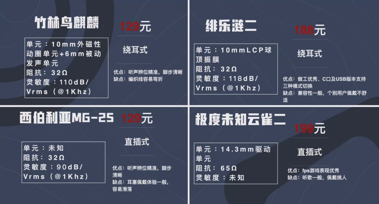 麒麟、mg-2s、漣二和雲雀二算是這個價位比較值得推薦的幾款產品,從聽聲辨位和腳步清晰度這兩個方面來說,這四款產品都是非常合格的。