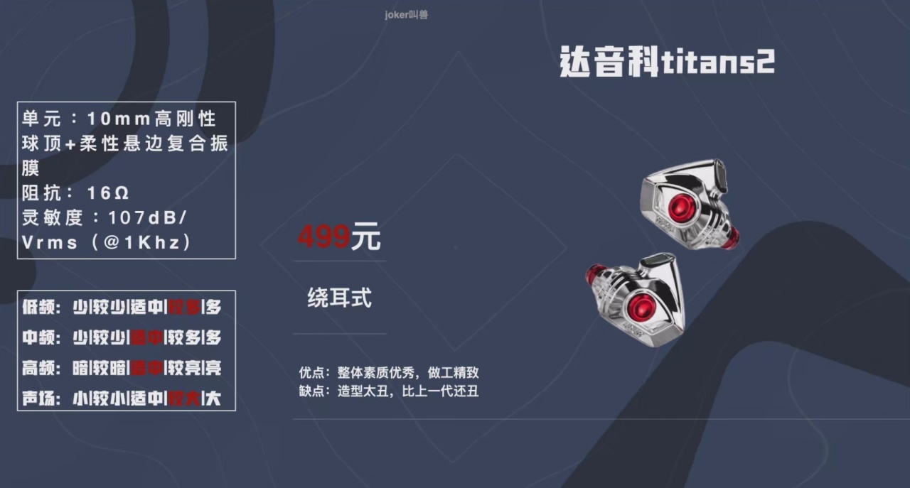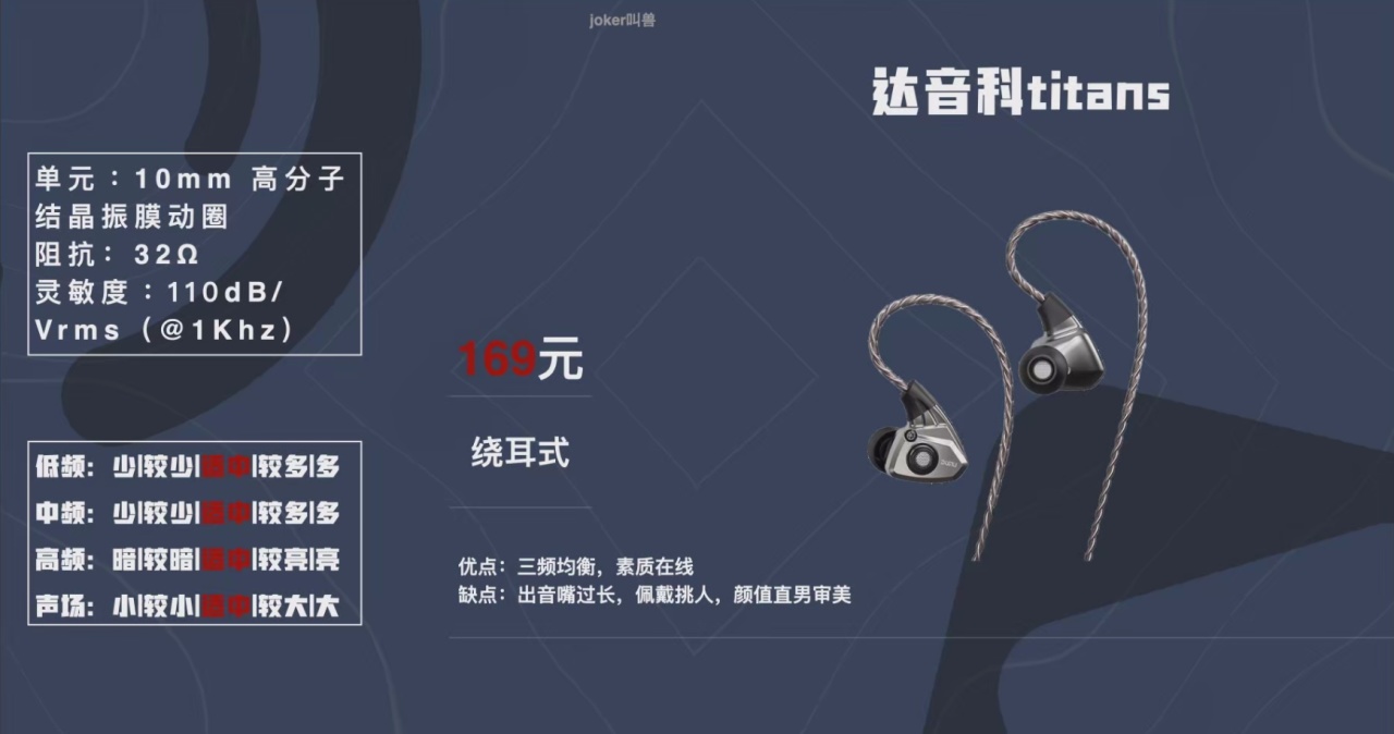 titans2則是達音科家一貫的聲音風格,這一代的調音也更加哈曼了一點,不過聽感上還是一如既往的乾脆利落,所以沒那麼寬鬆,男聲表現的話是優於女聲的。這三款產品都可以放心選擇,只要適合你的聽音風格就肯定是踩不到雷的。