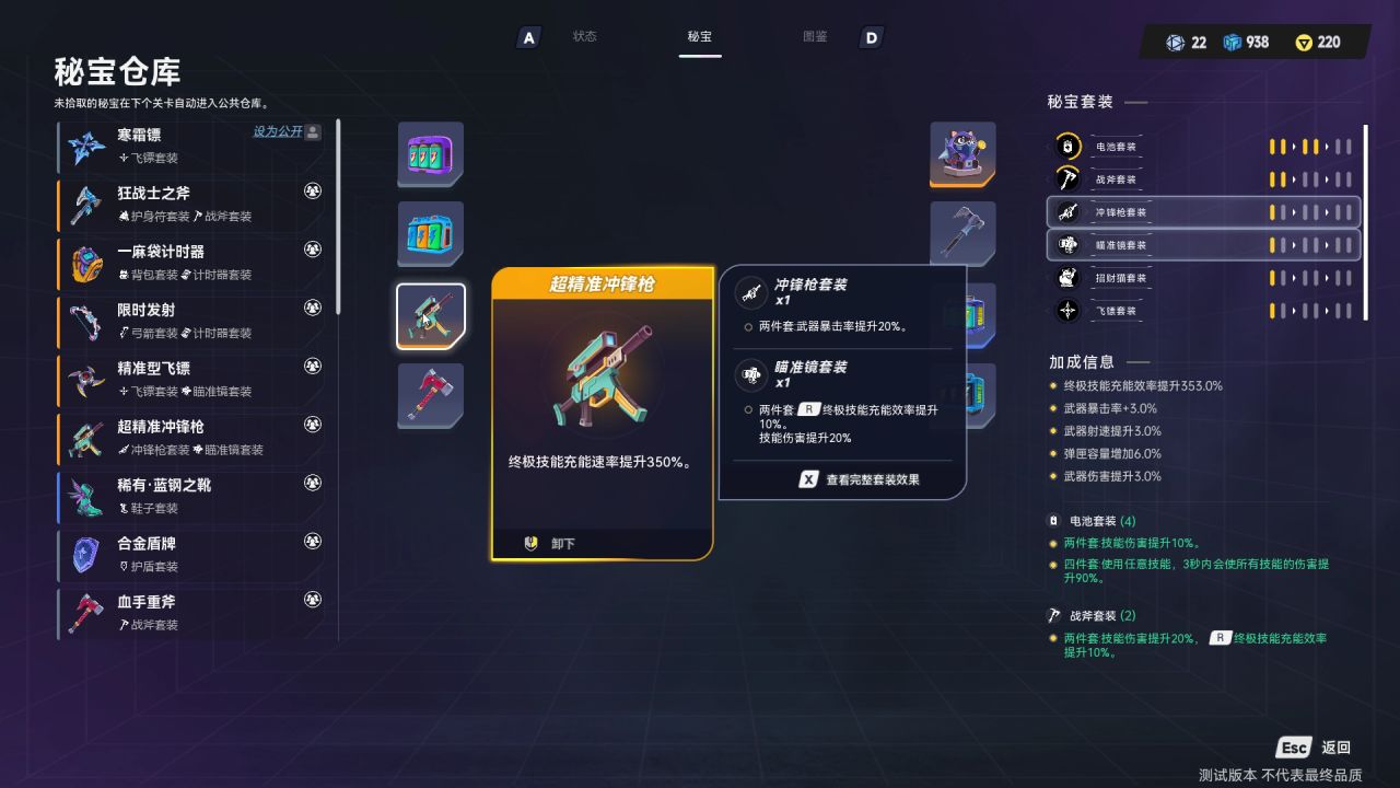 它的肉鸽元素给我的感受是“十分丰富”,局内对战类似于闯关模式,每个关卡就是一个战斗房间,地形和敌人由虚拟矩阵随机创造,打完所有敌人就可以生成各种增益效果,分别是给人物技能赋予特殊加成的法则之力、加属性加效果的秘宝等,不同的选择能衍生出截然不同的玩法,将随机性与策略性结合得很好。