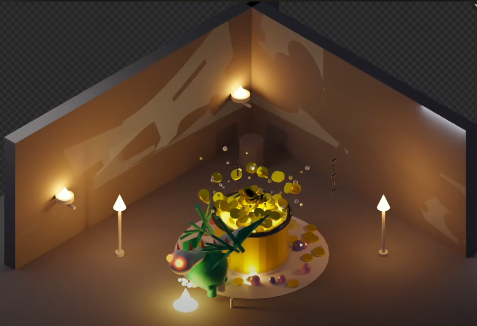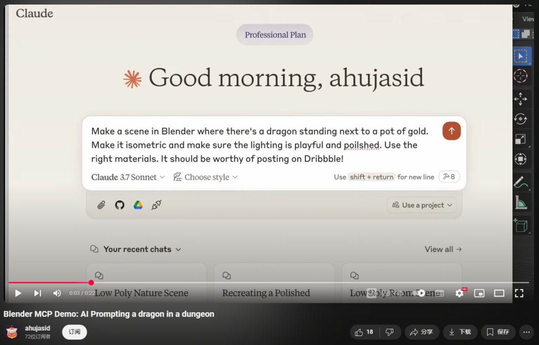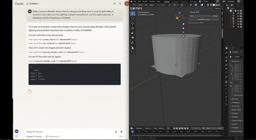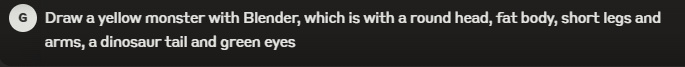 視頻裏,作者直接在對話框裏輸入: “ 請用 Blender 幫我建立一個場景,有一條龍站在一罐金子旁邊 ” 。