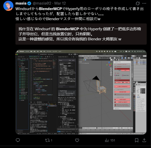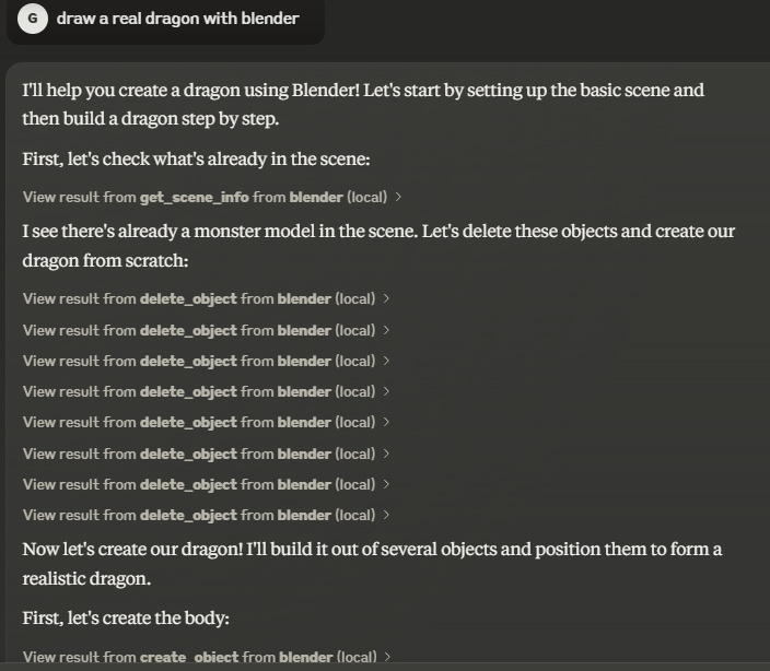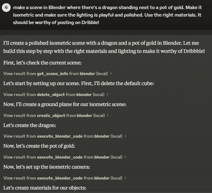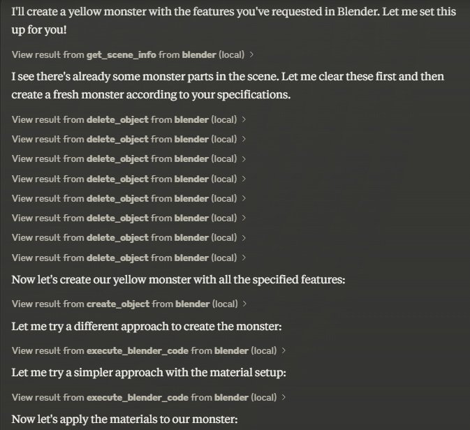 隨即, Claude 就開始調用 Blender 開始建模了,很快啊。