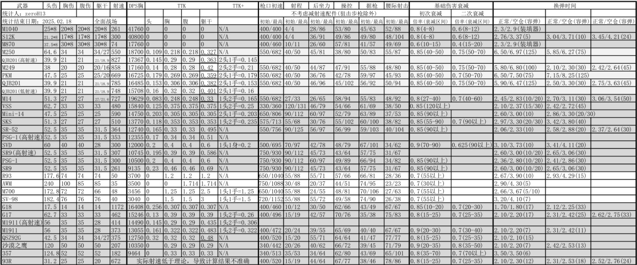 全面战场霰弹枪、轻机枪、精确射手步枪、狙击步枪、手枪数据