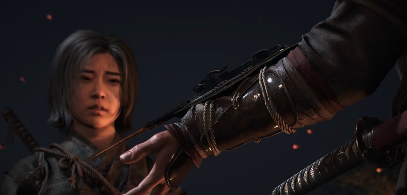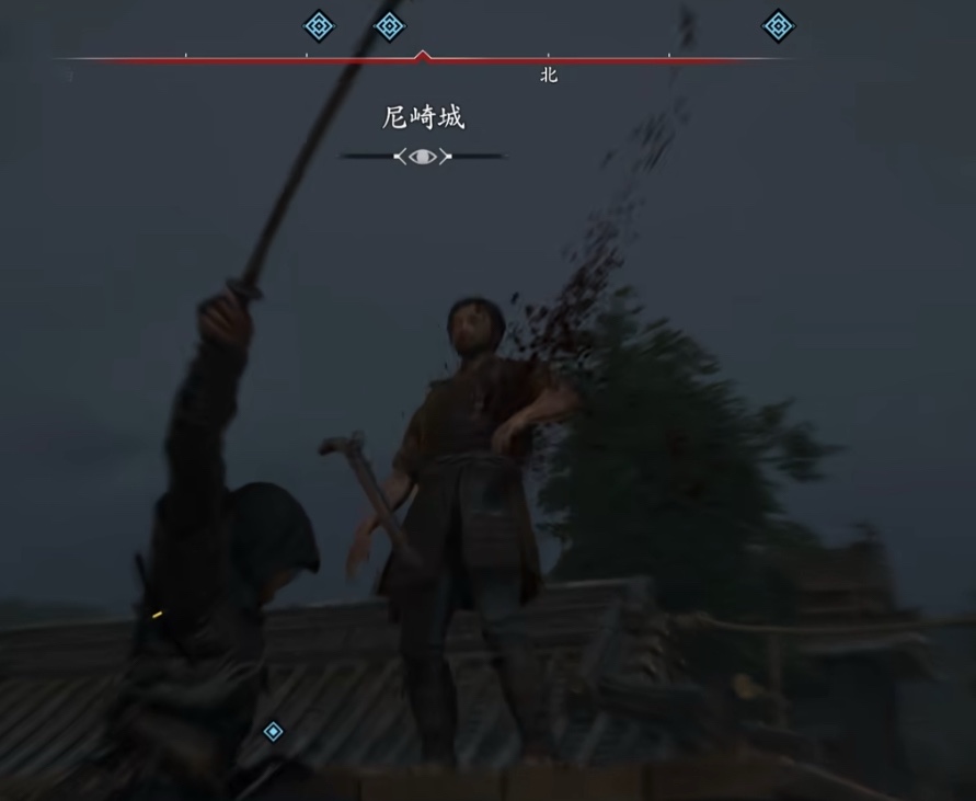 接着奈绪江先一步苏醒,为了夺回木盒,独自一人前往交野城。单杀了之前害她破相的怨鬼武士,奈绪江夺回木盒,火速逃往城外,这时全游戏第一个高潮来了,远处一女子化身老6,一枪将奈绪江放倒,侧翼一壮汉持刀杀出,欲毙其命。危机时刻,奈绪江老爹从天而降,一刀将壮汉砍成一只耳。