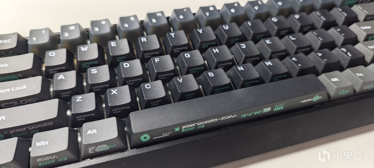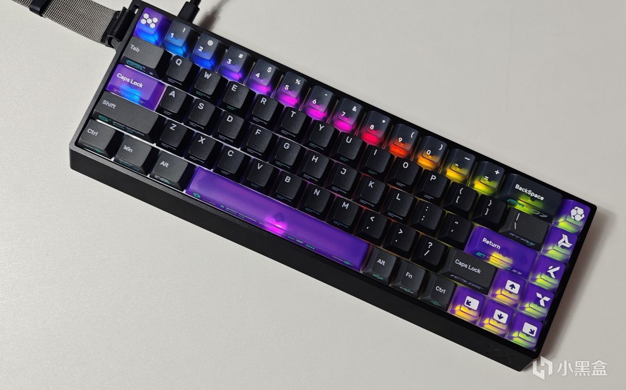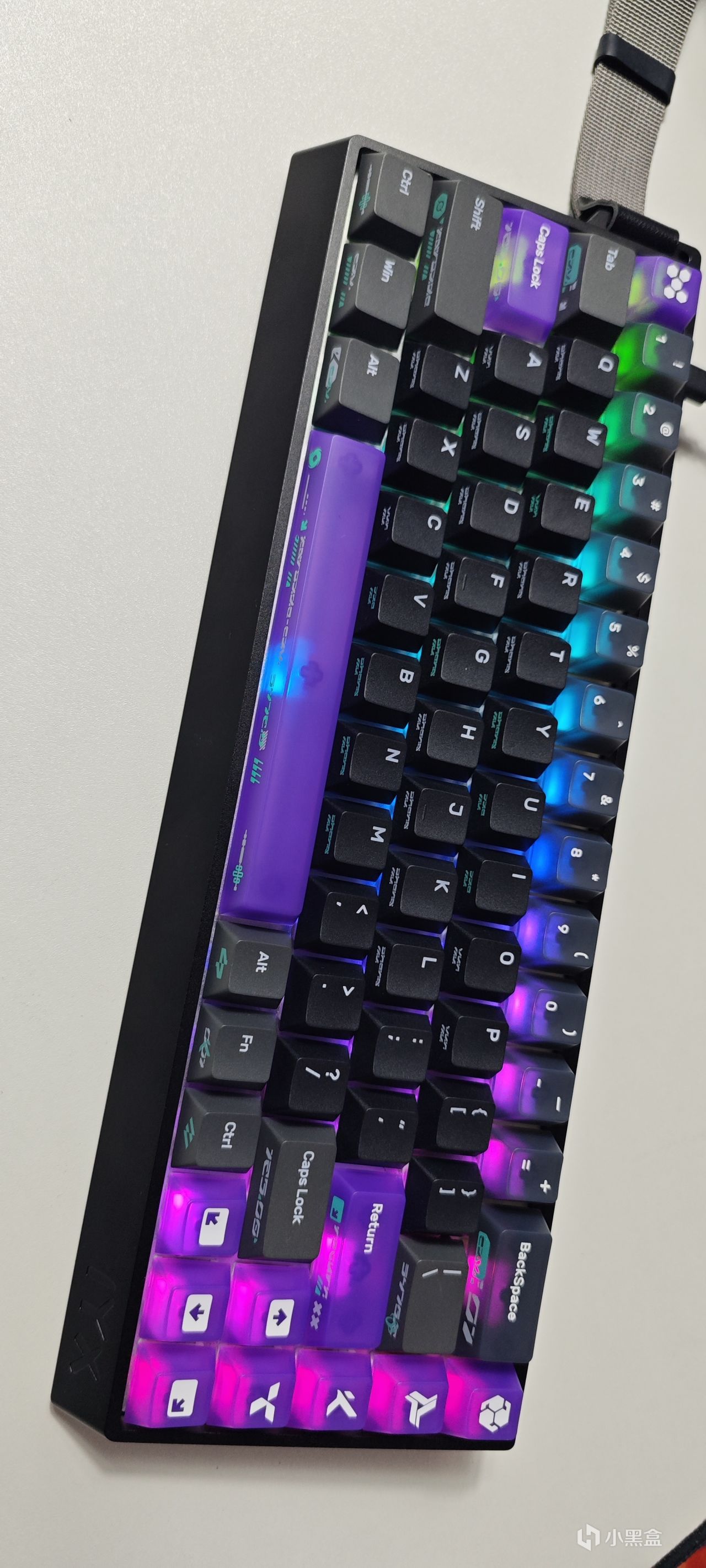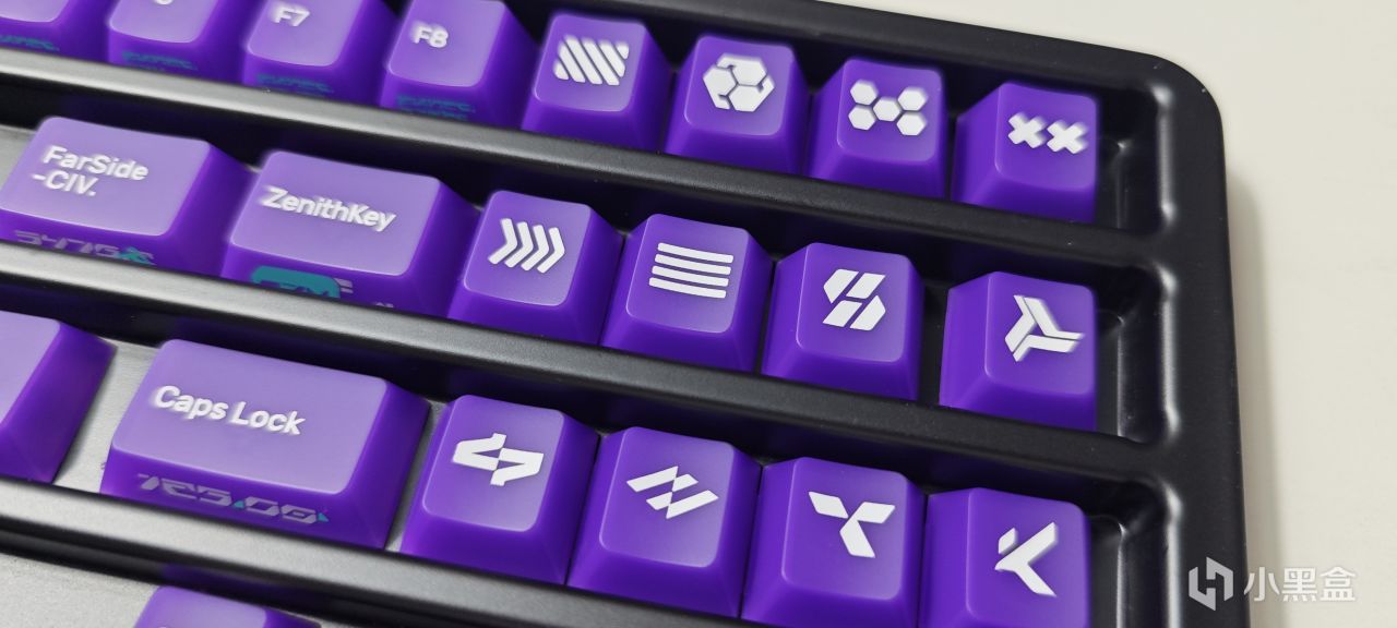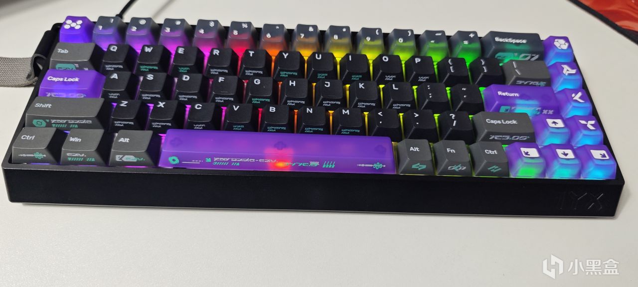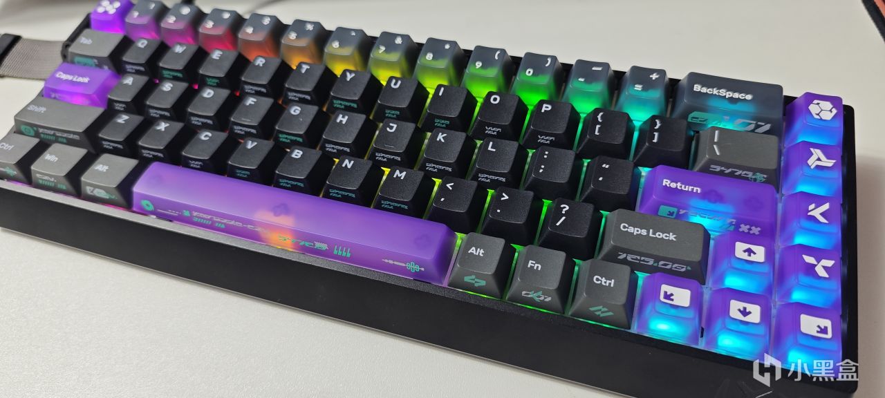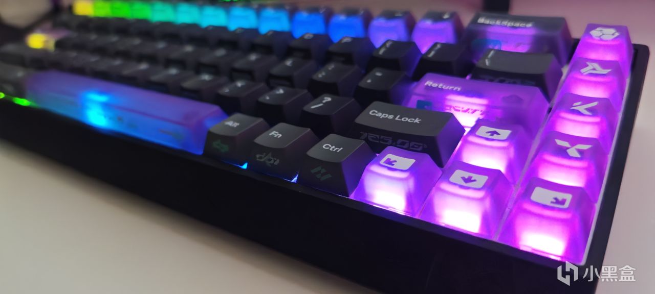 這款也是半透PC鍵帽,相比於剛剛的灰色半透PC鍵帽,黑紫的搭配,顏色更加豐富。裝上去後顏值更加出色,開啓燈效的時候有一種賽博朋克的科技風格。