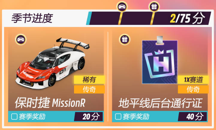 春季賽20分進度獎勵爲2021款保時捷 MISSION R和40分進度獎勵爲地平線後臺通行證