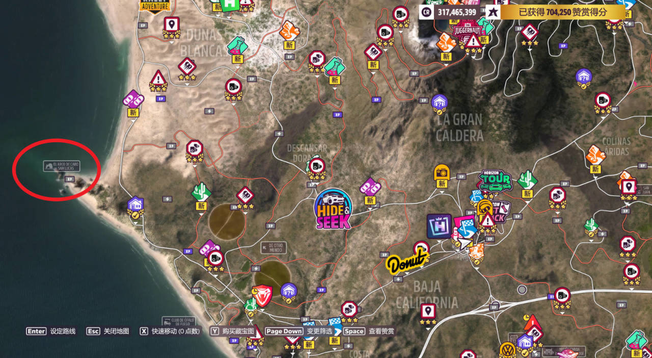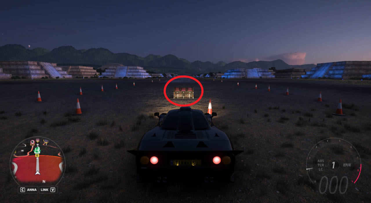 駕駛任意復古超級跑車在測速照相獲得3星,即可觸發寶箱大致範圍,位置如圖,完成獎勵爲300馬拉松點數