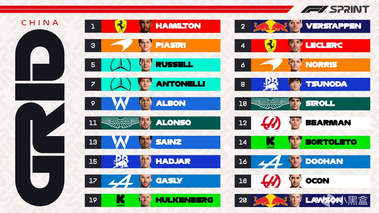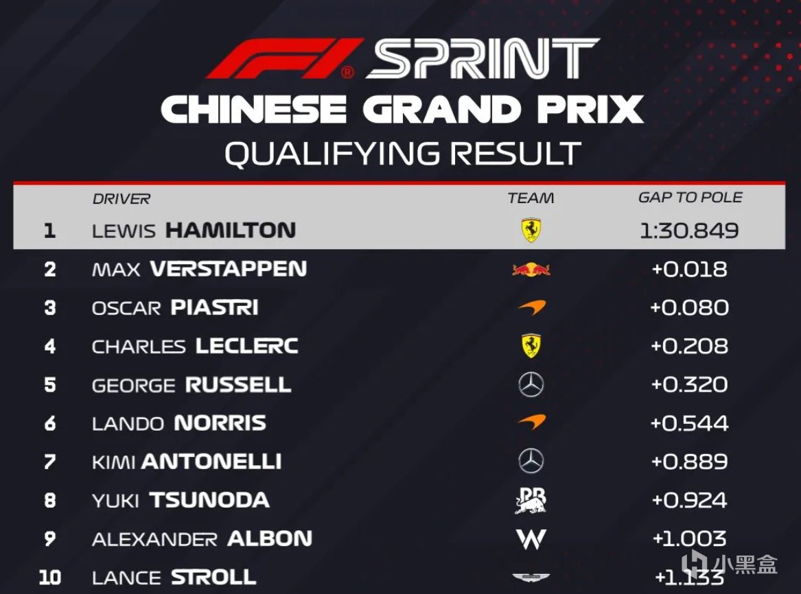 SQ3,车手们换上软胎后,皮亚斯特里一度以 1:30.929 刷新赛道纪录,但汉密尔顿随后以 1:30.849 反超夺冠,为法拉利车队赢得首个冲刺赛杆位,维斯塔潘最后一圈第三段刷紫,以 0.018秒 微小差距屈居第二,皮亚斯特里第三,勒克莱尔、拉塞尔分列四五,诺里斯在14号弯失误导致仅列第六!