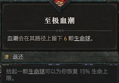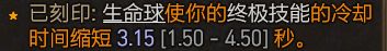 這裏我們再以死靈法師血潮爲例,通過技能樹中的,至極血潮配合裝備中的訊血統御威能形成聯動,達到拾取生命球來減少血潮的CD