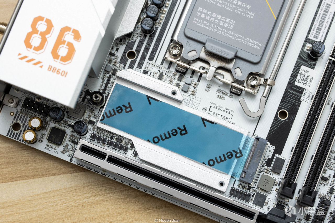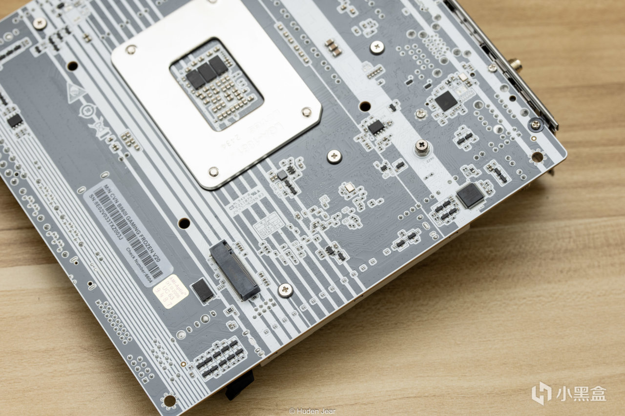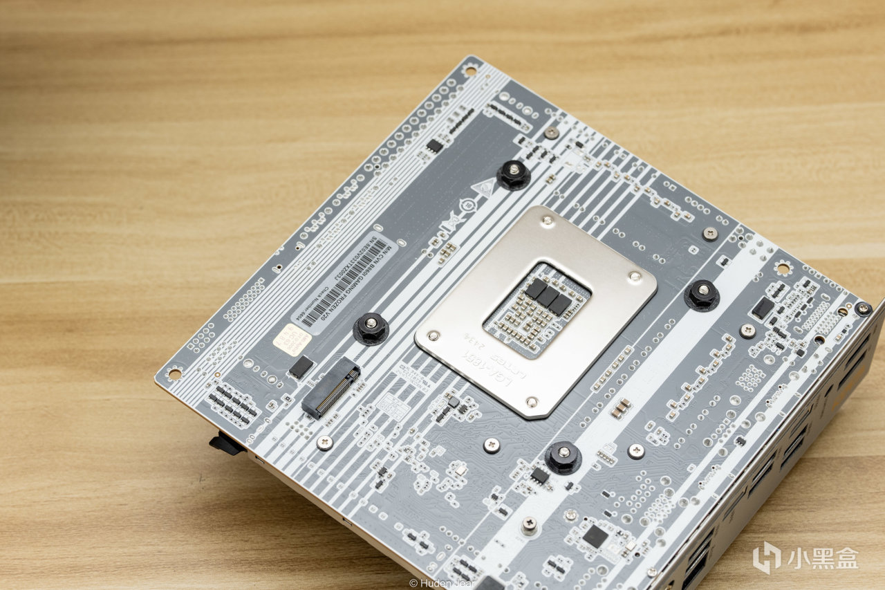 主板有兩條M.2接口,都是2280長度,一個在正面,上下都有硅脂墊接觸的散熱片,散熱很不錯,另一個在背面,這也是比較常見的ITX擴展方式。