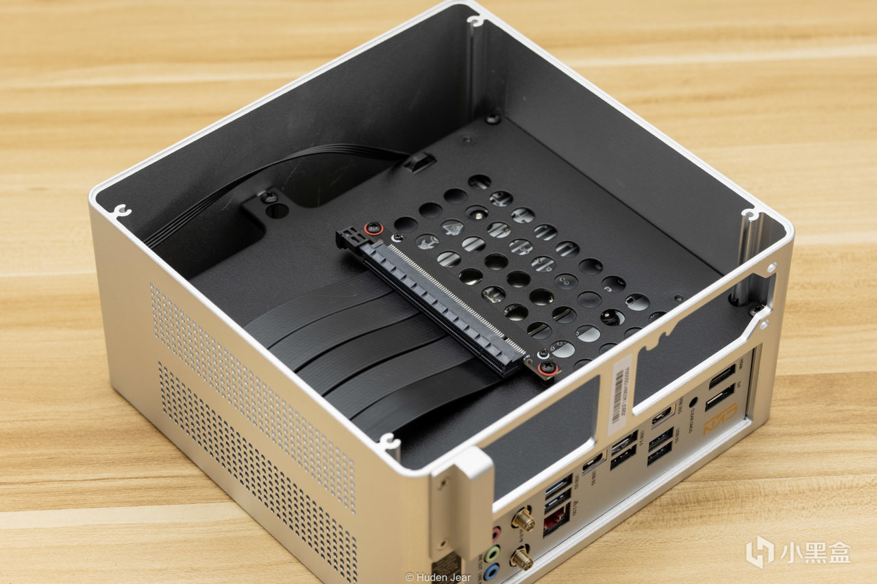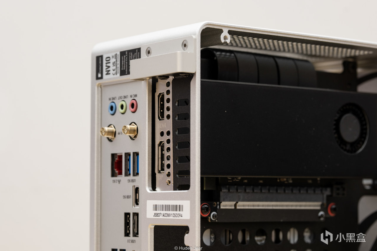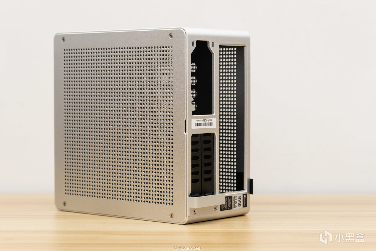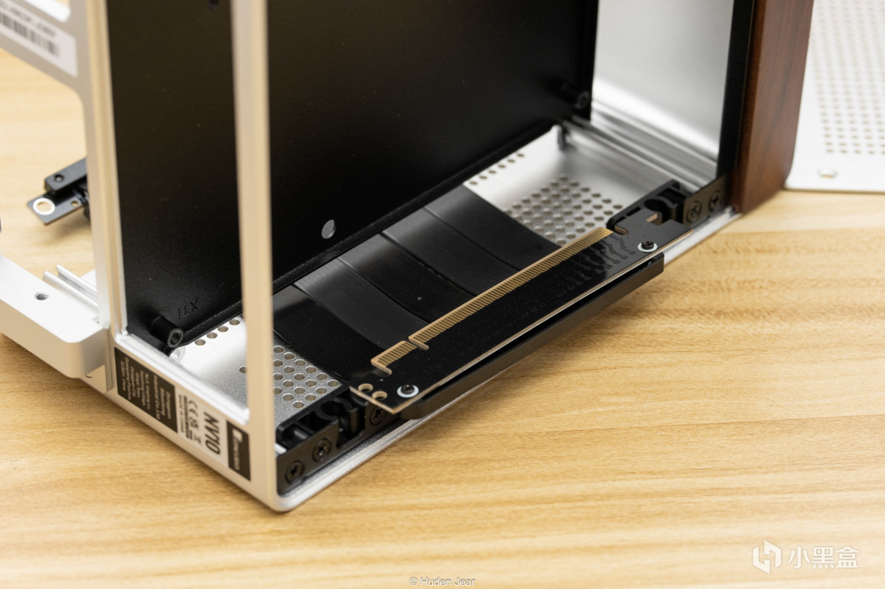 背後的接口區分爲三個,顯卡主板和電源,所謂背靠背就是主板和顯卡不在同一邊,而是要通過延長線鏈接到背面,把顯卡的高度轉化到Z軸上,這樣就能省下來不少體積。機箱側板使用的是碰珠固定