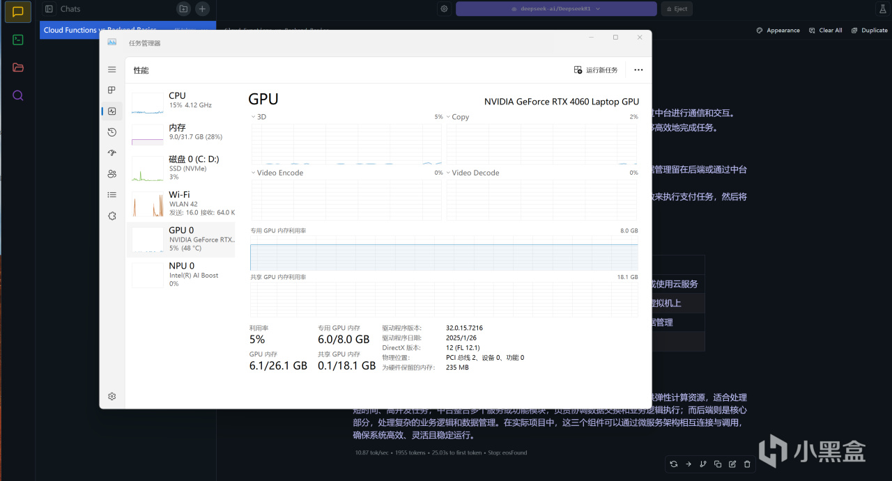 最後來測一下deepseek的推理吧,要跑這個顯卡還是有點難爲他了,顯存支持到8B的模型就到頭了,再多就要使用內存,不過10tps的推理速度倒也是勉強能用
