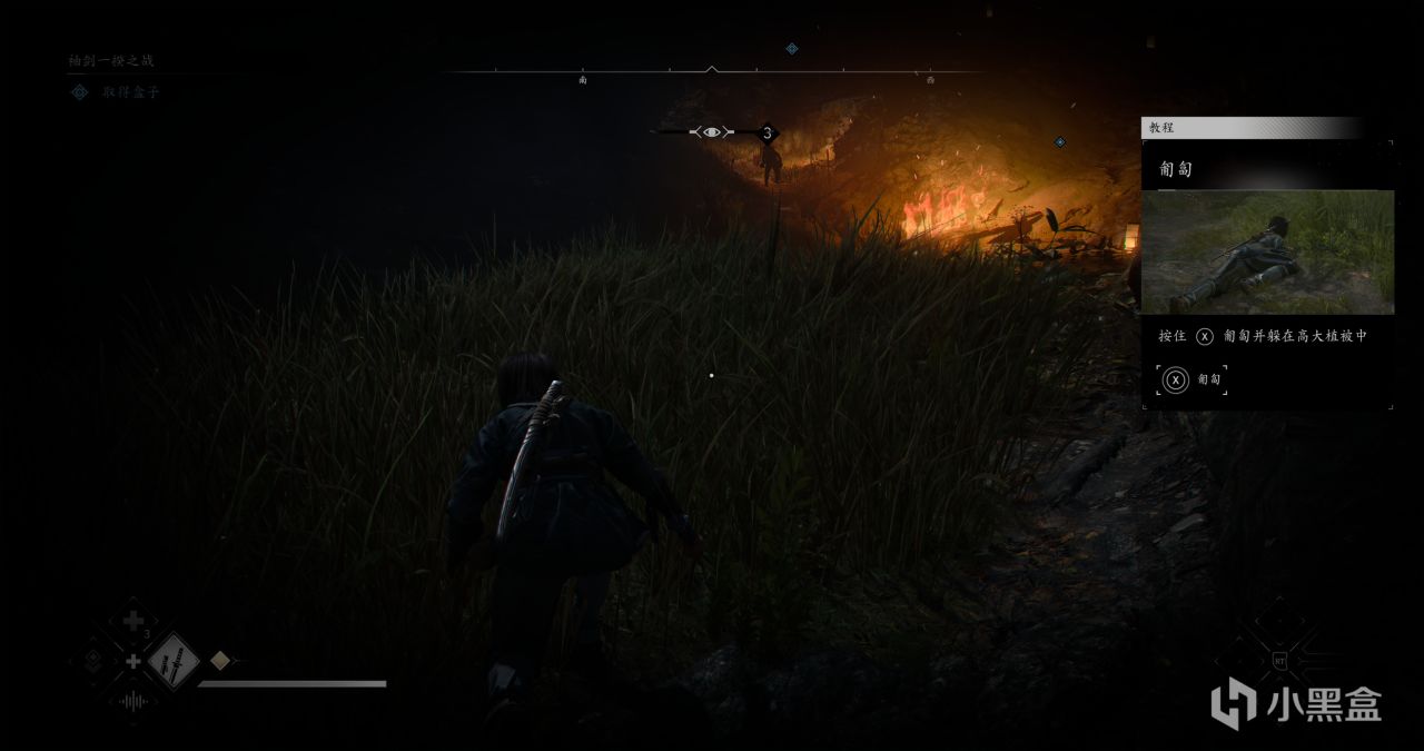 接下来这段路需要匍匐向前,注意需要匍匐前进避开织田家的武士,敌人有警觉条,从白条变黄条再变红条。