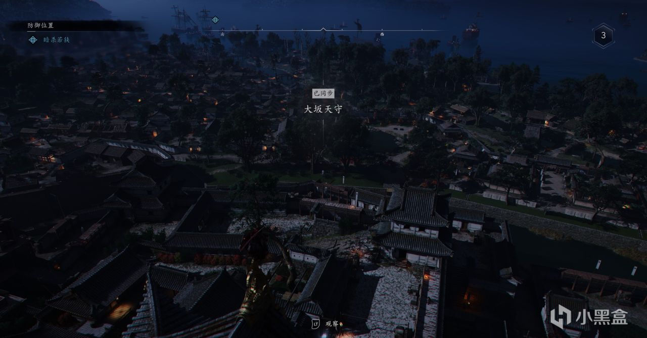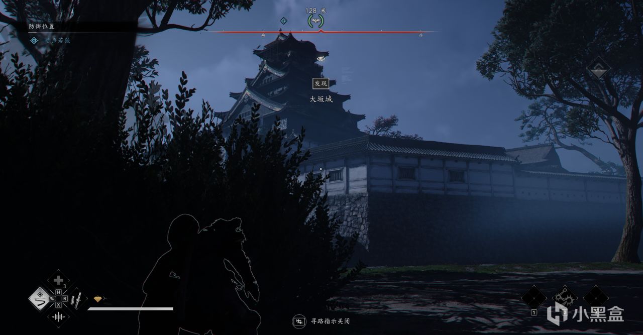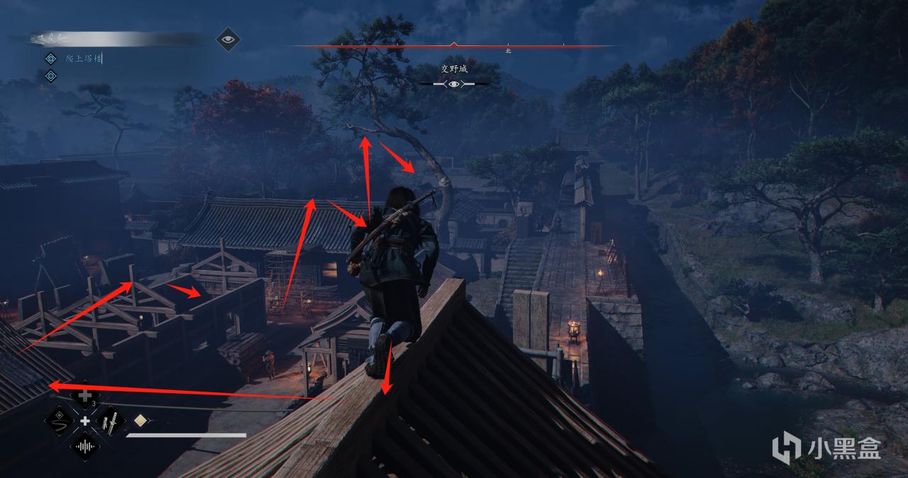 跑到高出顺着下图这个方位偷听对话,然后再往前到最高的塔楼调查情况,最后回去找百地三太夫复命,这个小支线真正的伊贺人结束。