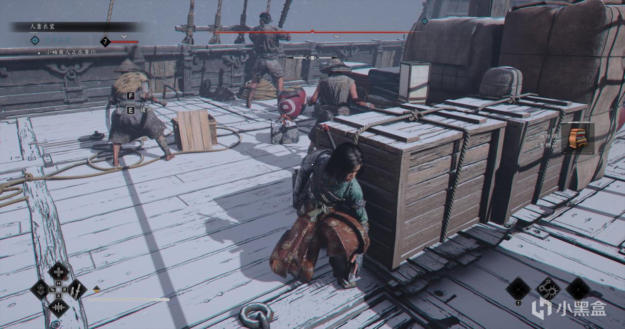小袖先需要去找丝绸,我们从千利休家出门,左手海边船上去偷丝绸。