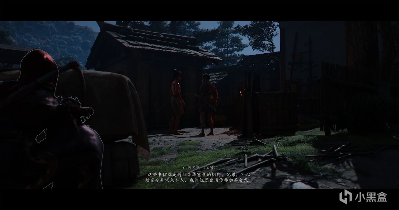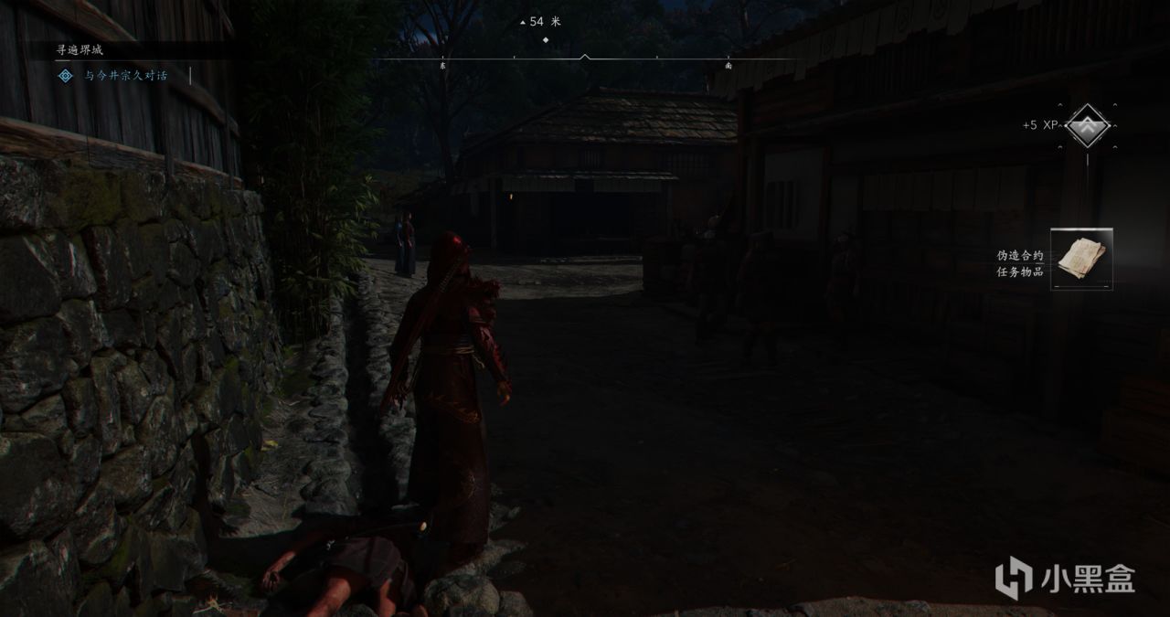 婆婆赠予我们武士刀,同时见到了百地三太夫,我们继续做回忆任务,需要匍匐潜行,拐角处遇到了一个武士,在将死之际,我们捡起地上的刀杀了男武士,这也是我们第一次杀人。