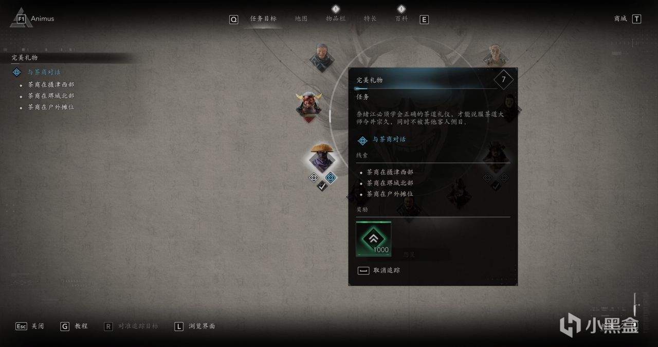 左上角任务提示,茶商的摄津西部、堺城北部、户外摊位,我们从平次铁匠那边出来,一直往北可以看到户外摊位,和前面的商人对话,茶艺大师千利休会过来插话,我们继续跟着千利休到他家里去。
